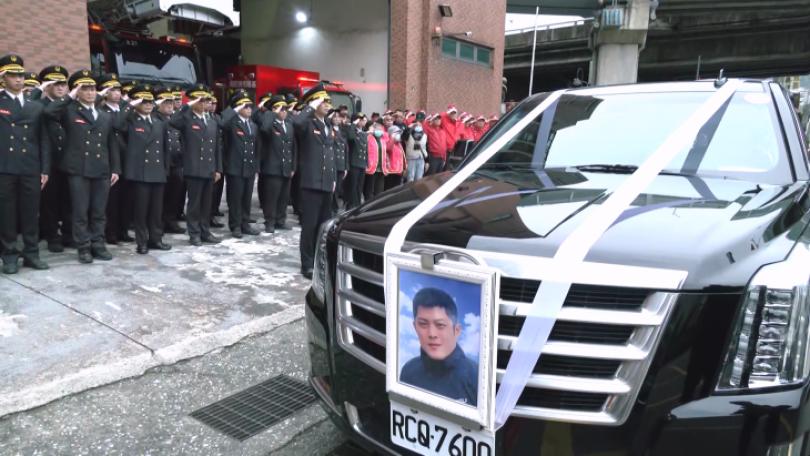 日前因為搶救受困火場的民眾,不幸殉職的勇消詹能傑,3日舉行公祭,移靈車隊上午11時20分左右抵達仁愛分隊,之後移靈到基隆市立殯儀館懷恩廳,下午1時30分開始公祭儀式。