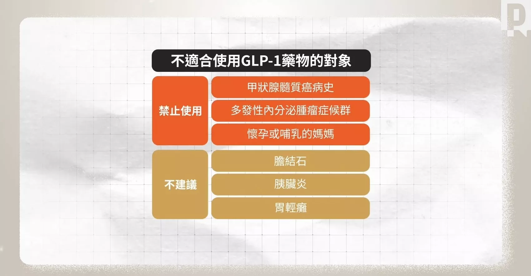 瘦瘦針是處方藥,必須先諮詢醫師,尤其有甲狀腺髓質癌病史、多發性內分泌腫瘤症候群、懷孕或哺乳的媽媽不能使用。其他像是膽結石、胰臟炎等病人也不建議使用。