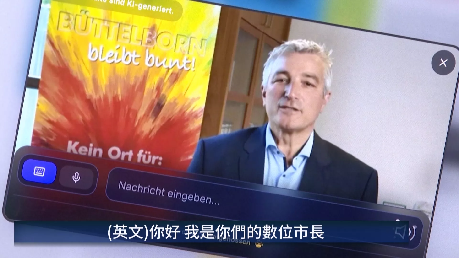 一下說英文,一下說法文,螢幕中一頭淺色髮色,穿著一身西裝的男子,是法蘭克福南方的布特爾伯恩市的市長梅克爾的分身。市府以他的外型為基礎開發出的AI市長,能用不同語言回答市民的各種問題。