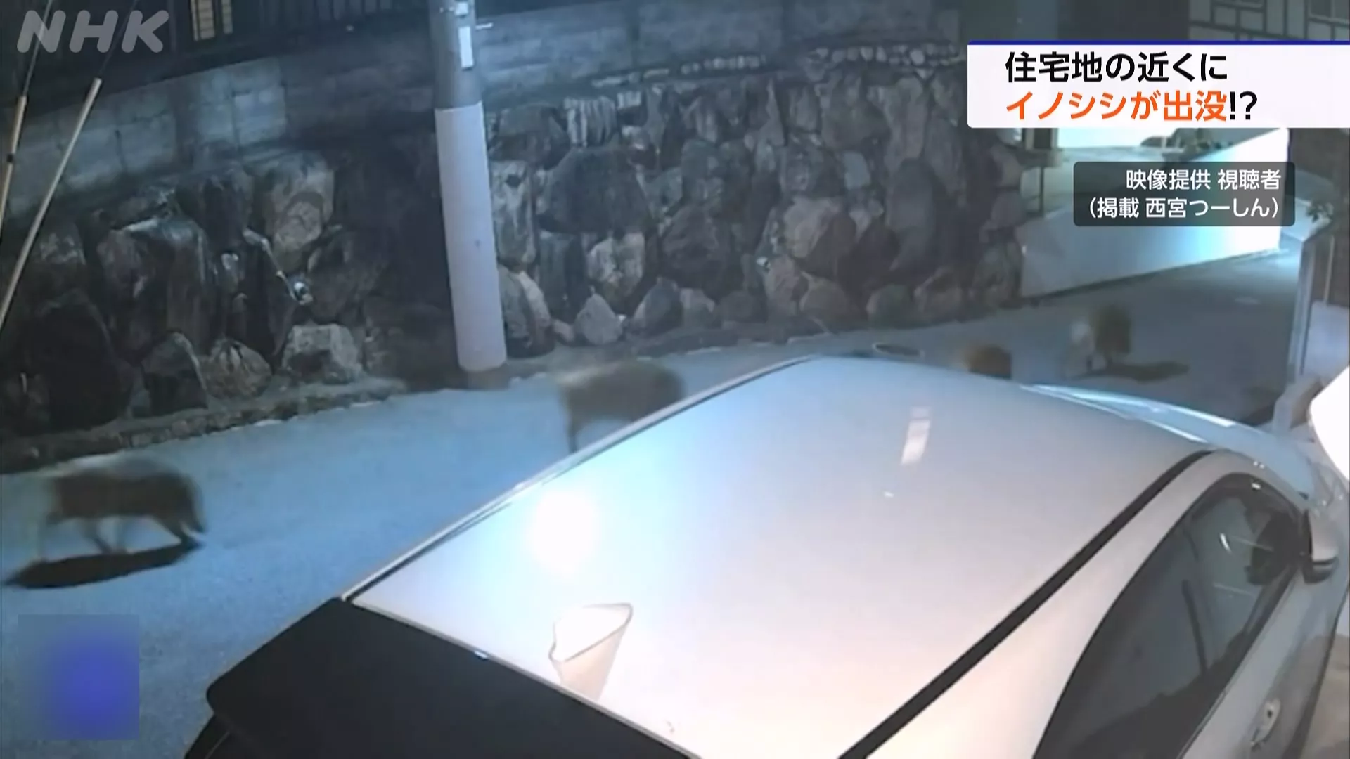 深夜的兵庫縣西宮市街頭,大山豬帶著4隻小山豬出現在道路中央,一隻接著一隻尋找食物;還有民眾夜晚開車經過千葉的國道路段,差點撞上3隻山豬。
