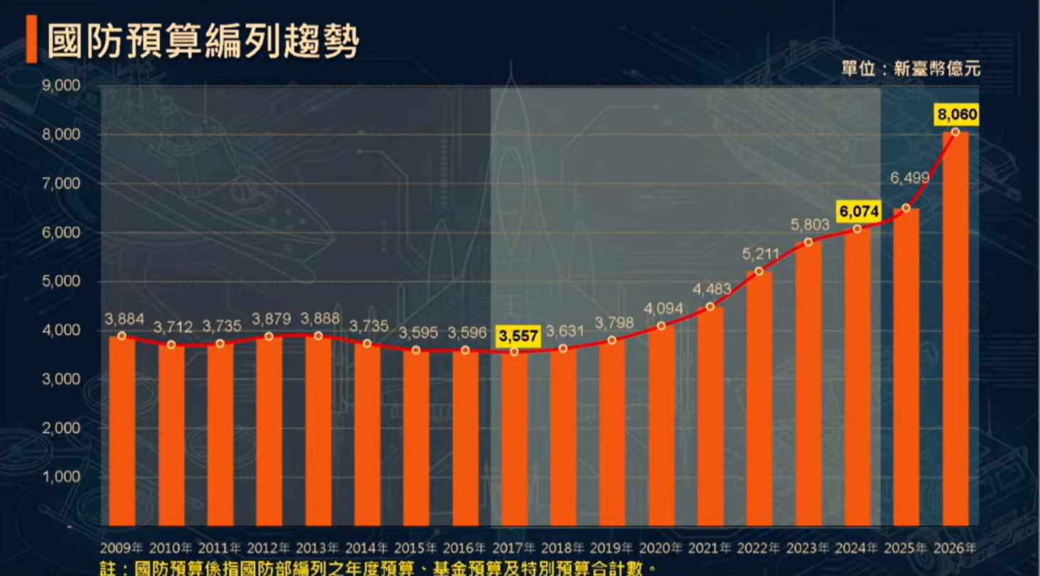 顧立雄則說明,台灣國防預算自2017年蔡英文政府時期編列3557億起逐年增加,至2024年編列6074億,成長幅度達70.8%,顯示國家對國防的重視。2026年度則規劃編列8060億元,這樣的國防資源挹注,對於投資新式武器裝備、維持現有系統妥善以及照顧官兵福利待遇、吸引優質人才都有所助益。