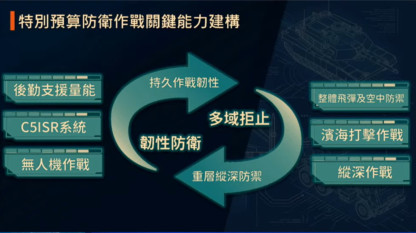 梅家樹則說明強化防衛韌性及不對稱戰力的特別預算內容,其中防衛作戰的兩大準備方向為「多域拒止」及「韌性防衛」。