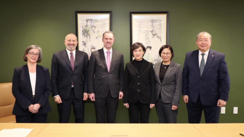 現在畫面上看到的是簽署儀式後的合影。出席人員包括美國商務部長盧特尼克(Howard Lutnick)、美國貿易代表葛里爾(Jamieson Greer)、AIT華盛頓總部執行理事藍鶯(Ingrid Larson)以及我國駐美代表俞大㵢大使、行政院副院長鄭麗君跟政務委員楊珍妮。