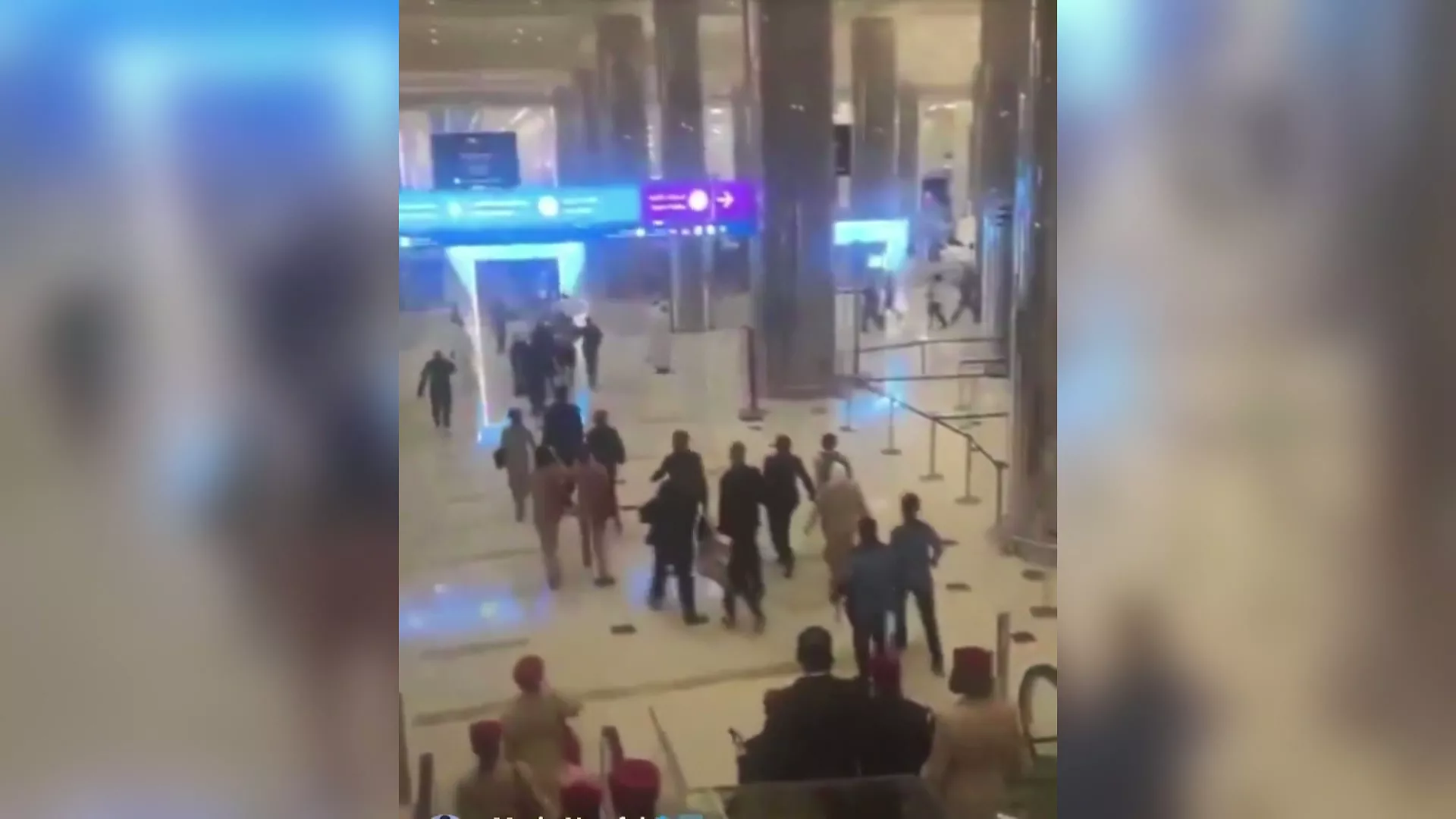 人員加緊腳步疏散,美國與以色列聯手發起軍事行動衝擊中東區域安全,伊朗最新飛彈攻擊後,杜拜國際機場出現煙霧。