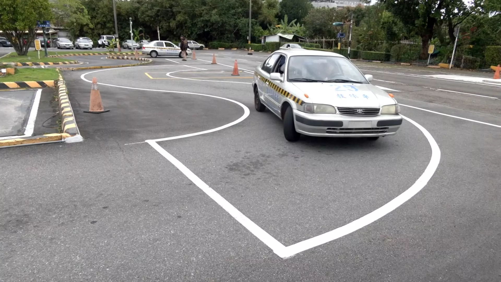Pengemudi menjalankan mobilnya dengan hati-hati sesuai instruksi pelatih. Sejak pagi, peserta ujian SIM sudah tiba di kursus latihan mengemudi. Sejak sistem baru ujian SIM mobil diberlakukan pada akhir Maret, pengemudi yang tidak mendahulukan pejalan kaki di area penyeberangan dan tidak menoleh untuk memeriksa titik buta, nilainya dipotong 32 poin. Guna meningkatkan konsep mendahulukan pejalan kaki, Biro Jalan Raya merevisi standar penilaian ujian SIM, menambahkan soal ujian area penyeberangan, mencakup tidak mengurangi kecepatan, tidak berhenti, tidak menoleh untuk memeriksa titik buta sebelum melaju, tidak memberikan tanda isyarat, nilainya akan dipotong 32 poin, yang berarti tidak lulus dan harus mengikuti tes ulang.