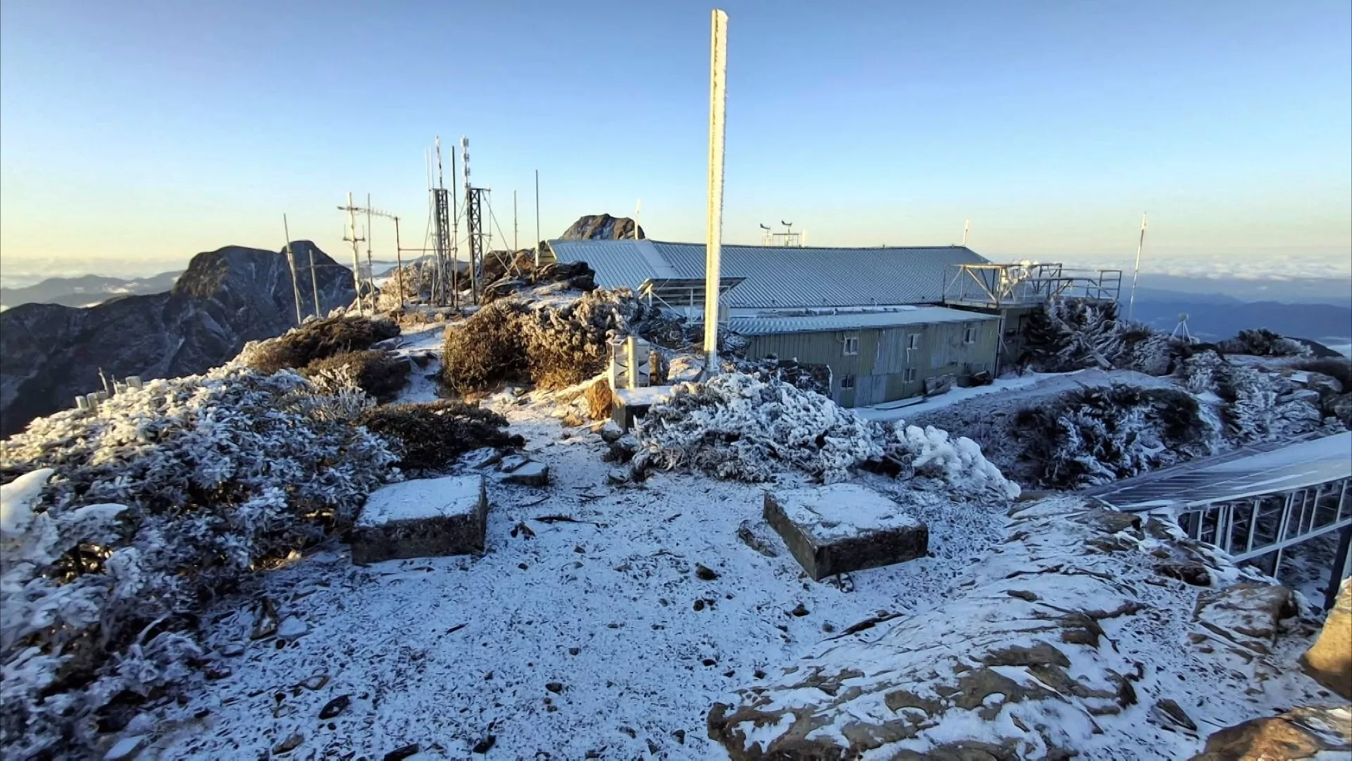 Lapisan salju tipis tampak menyelimuti puncak Gunung Yushan, bak taburan gula halus di atas pegunungan. Salju kembali turun di sini dini hari ini, dengan suhu terendah minus 8-9°C. Meskipun salju telah berhenti di siang hari, fenomena embun beku tetap tampak di puncak gunung.