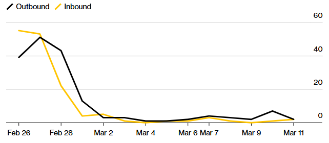 彭博社以AIS(船舶自動識別系統)追蹤經過荷姆茲海峽船隻數量後則發現,在美伊衝突前,每日進出海峽的船隻約有百艘,但從3月起,每天幾乎僅有個位數船隻出入,顯示海峽上的交通已近乎陷入實質停擺。