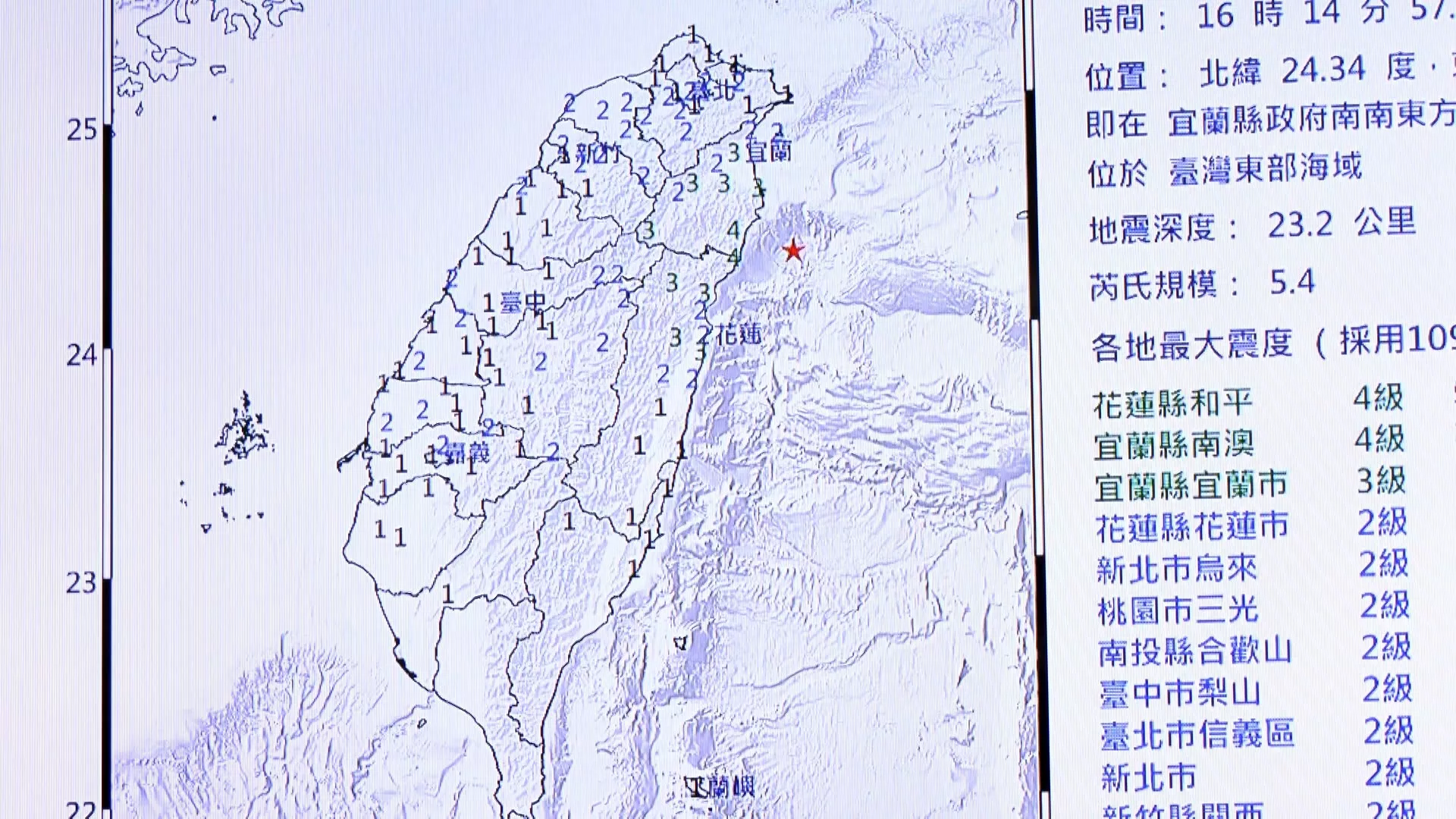ไต้หวันแผ่นดินไหวต่อเนื่อง! นอกชายฝั่งอี๋หลานขนาด 5.4 ไถหนาน 4.3