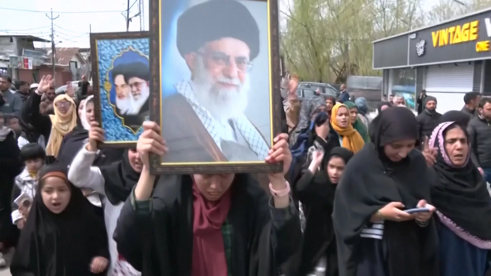 大批什葉派穆斯林女孩,高舉伊朗遇害領袖哈米尼的肖像,高唱抗議歌曲走上街頭。開齋節這一天, 聚居在喀什米爾首府斯里內加的穆斯林,沒有開心慶祝,而是穿上黑衣,悼念遭空襲殺害、同為什葉派的伊朗領袖。
