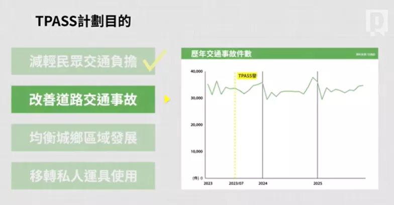 TPASS政策未來是否繼續仍有變數,但上路兩年的效益已可評估。根據行政院的資料,TPASS有四大政策目標:減輕民眾交通負擔、改善道路交通事故、均衡城鄉區域發展、移轉私人運具使用。使用者荷包確實減輕負擔了,但從近兩年交通事故總數來看,仍難以看出事故是否減少,均衡城鄉發展短期內也很難衡量。