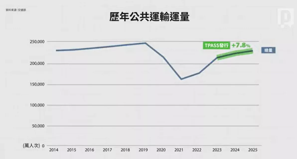 各種TPASS補貼的大眾運輸工具中,公車及國道客運運量增幅最低。2023到2025年台北捷運增加8%的運量,高雄捷運增加30%、台中捷運增加29%,桃園機場捷運及新北捷運增加的量最多,分別有39.9%及53%,台鐵也增加10.6%的運量,市區客運也就是公車只增加3.1%,包含國道客運在內的公路客運增加3.5%。