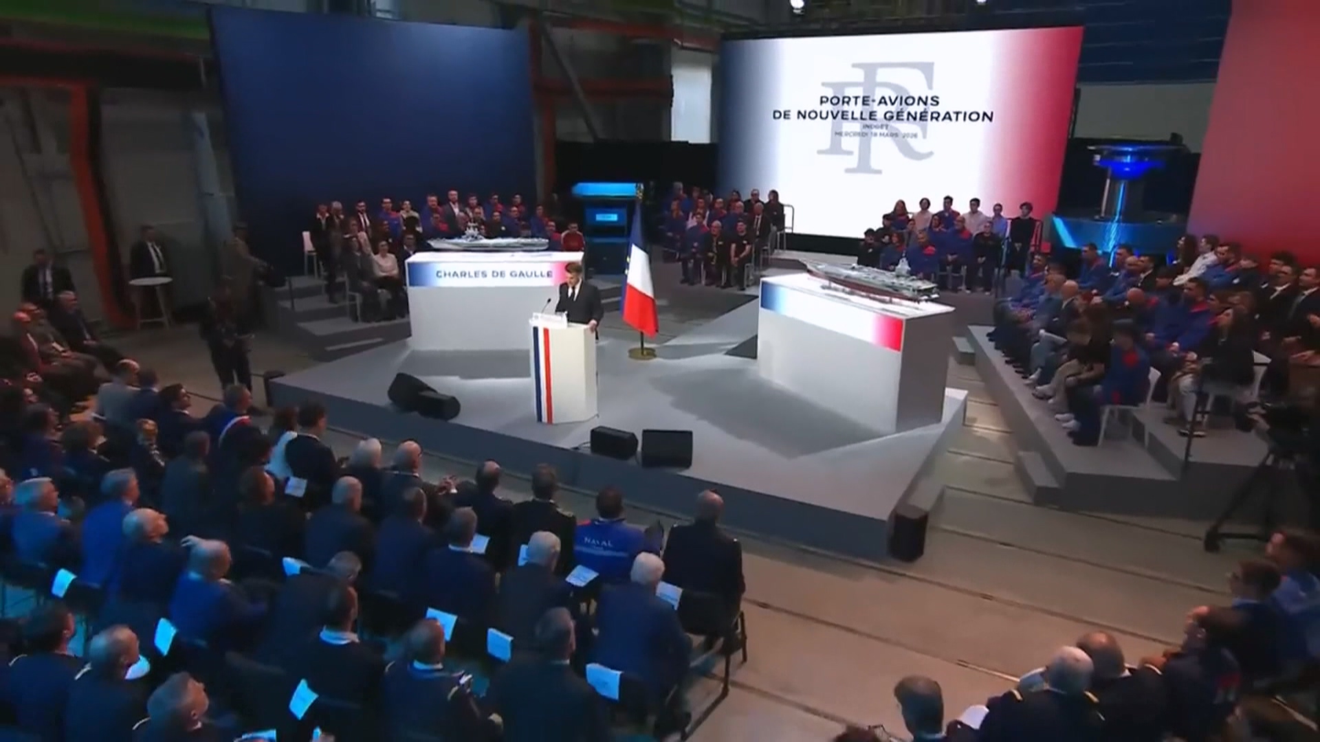 命名典禮會場演奏著法國國歌,法國總統馬克宏隨後走上講台,兩邊各擺放著巨大的航空母艦模型,一艘是現役的「戴高樂號」,另一邊則是新型的航空母艦。「戴高樂」是法國第五共和體制下的首任總統,也是二戰期間領導反抗運動的靈魂人物。