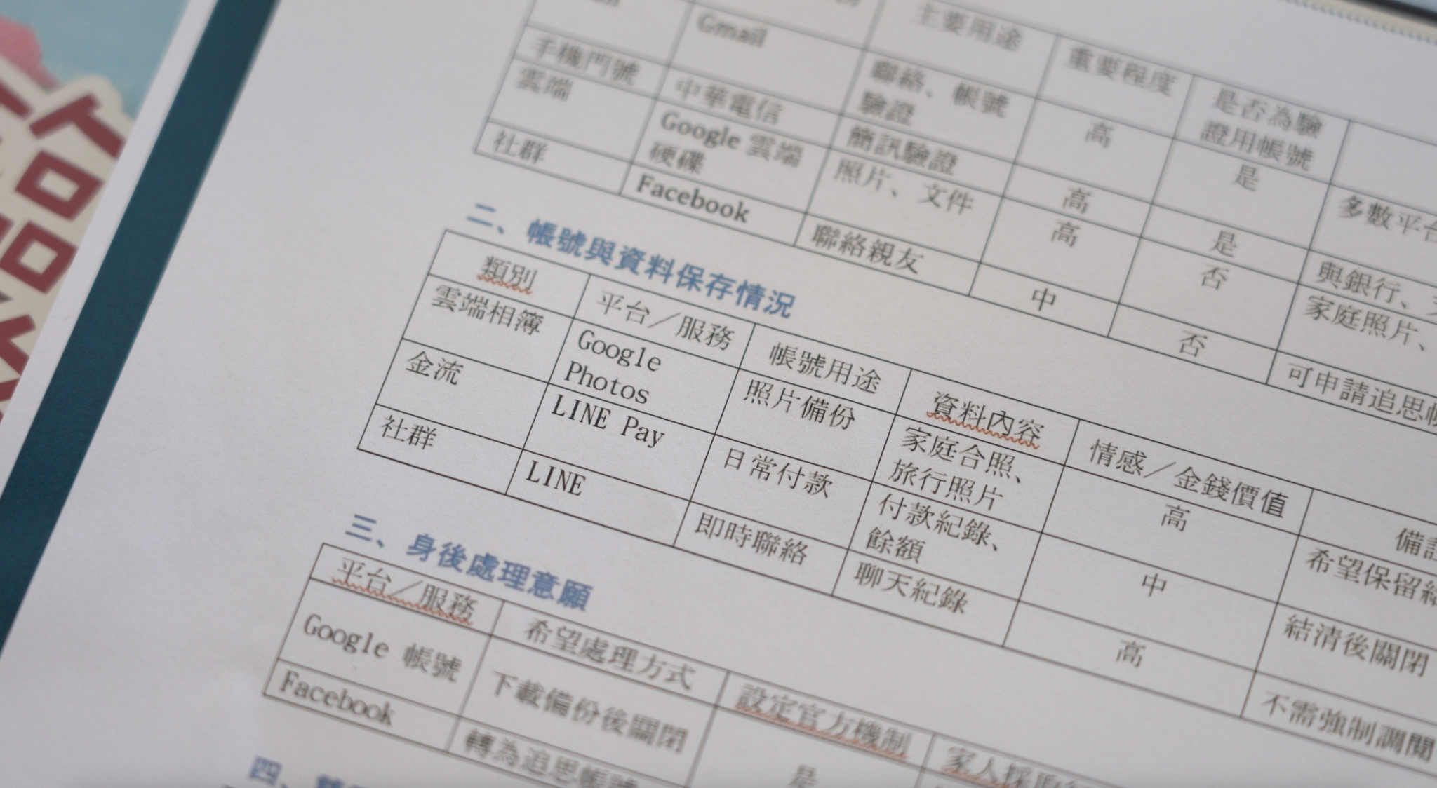 為了系統化管理這些看不見的資產,郭慧娟建議透過表格逐一記錄帳號類型、平台服務、儲存地點及具體的處理意願。在他的數位資產盤點表中,核心帳號如 Gmail、Facebook 被明確標註,並註明是否具備雙重驗證或備援管道。郭慧娟認為,這種盤點能讓家屬了解哪些資產如 LINE Pay 需要結清、哪些雲端相簿應保留給家人,甚至預先設定好 Facebook 轉為追思帳號。他指出,這種預先規畫能避免家屬在不知情的情況下急於刪除資料,或是因不懂操作而產生自責,為生者提供了清晰的行動指南。