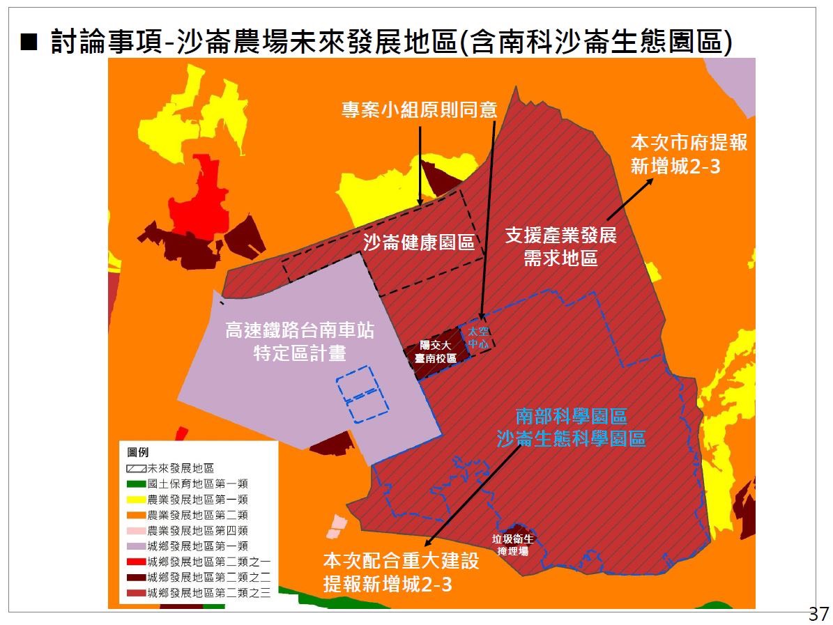 台南市府向國土審議會提報「沙崙生態科學園區」範圍中的508公頃以及其北邊的427公頃作為「支援產業發展需求地區」, 共計935公頃的農地(農2)變更為城鄉發展地區(城2-3)。