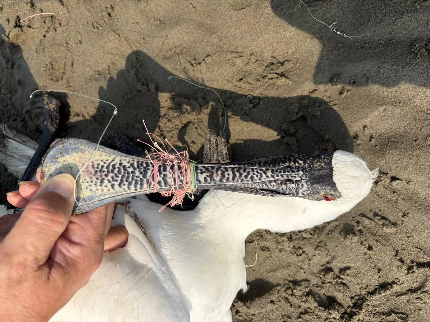 苗栗一名胡姓民眾4月11日上午在後龍西湖溪自行車鐵道上,發現一隻白色鳥類趴臥在地,靠近後確認為黑面琵鷺,且嘴喙及腳部遭數種釣魚線、漁網線纏繞,除協助移除魚線外,也通報苗栗縣農業處協助救援。