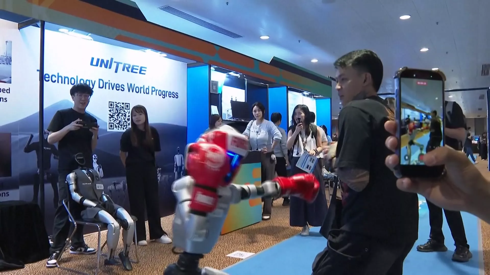 宇樹科技的G1機器人揮出鐵拳,親身體驗的參觀者不支倒地,笑著喊佩服。