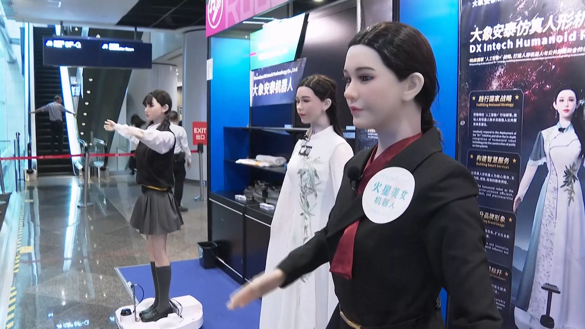 發展智慧城市與公共安全系統的杰創智能,輪子機器狗是AI巡邏的一環,遇到歹徒時會瞬間射出網子,把人攔截制服;深圳德承科技一系列外型細膩仿真的人形女性機器人,目前已在中國多地的博物館與政府機關上班,負責導覽與諮詢;諾柯達的機器人有情緒陪伴與教學的能力,甚至可以模擬不同的性格。