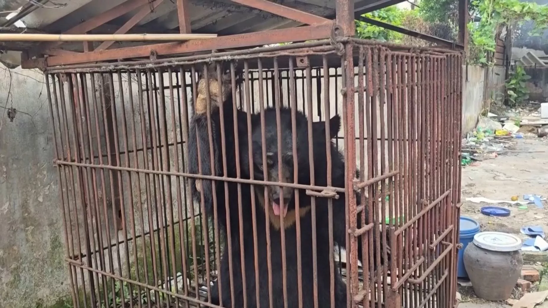 หมีดำตัวนี้ ก่อนจะได้รับการช่วยเหลือ ถูกขังอยู่ในกรงเหล็กแคบๆ มีอาการกระสับกระส่าย น้ำดีของหมีถูกใช้ในแพทย์แผนโบราณ โดยเชื่อว่าสามารถรักษาโรคเกี่ยวกับตับและถุงน้ำดี ทำให้หลายประเทศในเอเชียยังคงมีฟาร์มเลี้ยงหมีเพื่อรีดน้ำดี แม้ว่าเวียดนามจะออกกฎหมายห้ามตั้งแต่ปี 2005 และจำนวนจะลดลงมากแล้ว แต่ยังคงมีหมีราว 150 ตัวที่ต้องใช้ชีวิตในสภาพแวดล้อมที่เลวร้าย