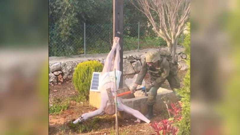 這張在社群媒體流傳的照片引發軒然大波,畫面中一名士兵手持大錘,敲打掉落的耶穌受難像。以色列國防軍調查後證實,照片中的士兵的確曾在黎巴嫩南部、靠近邊境的基督教村莊戴布執行任務。