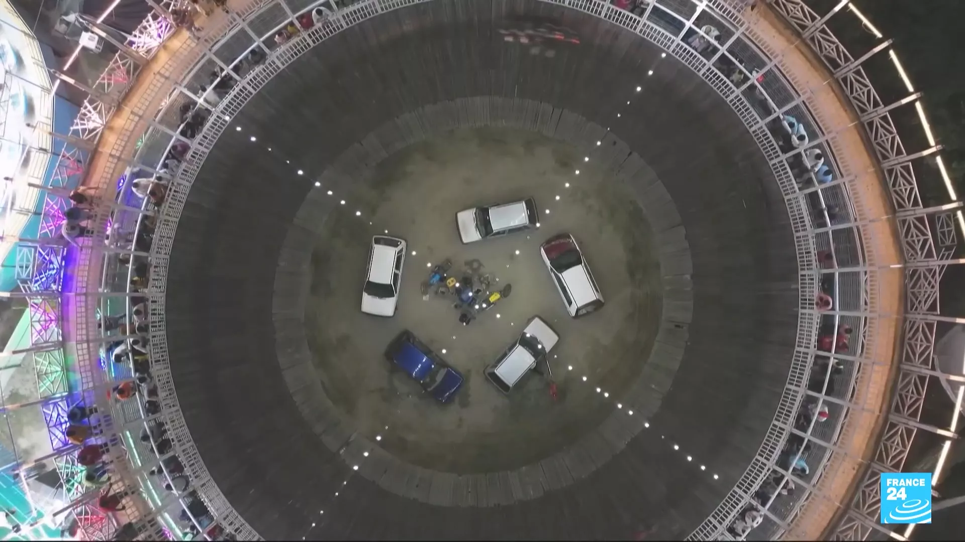 印度有種傳承數十年的驚險表演,被稱為「死亡之井」,特技車手駕駛汽機車,在直徑不到10公尺的圓柱狀建築內貼牆飆速,甚至高速中探出車外伸手拿賞錢。