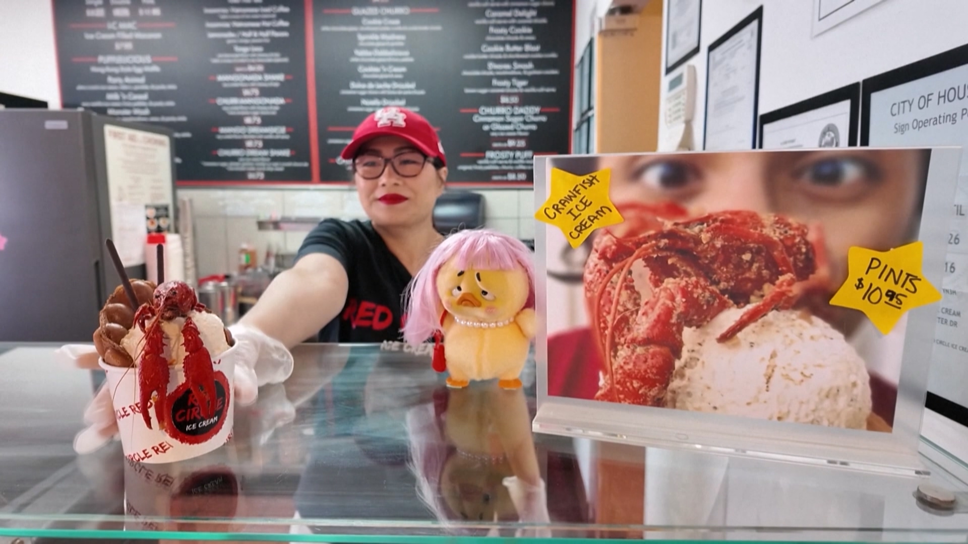 香港街頭小吃雞蛋仔,旁邊的一大球冰淇淋上面覆蓋一隻小龍蝦,美國德州的這家冰淇淋店在小龍蝦最肥美、價格最親民的時候,推出這款海鮮與甜點相結合的創意料理。