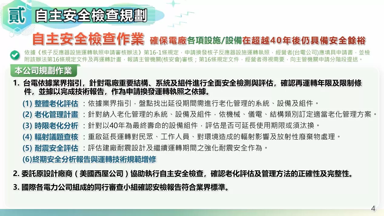 許永輝坦言,核電廠無法做到百分之百的安全,他承諾,等自主安全檢查作業全數完成、在台電已經充分努力的前提下,會向社會大眾說明,核三廠還有多少「殘餘風險」。