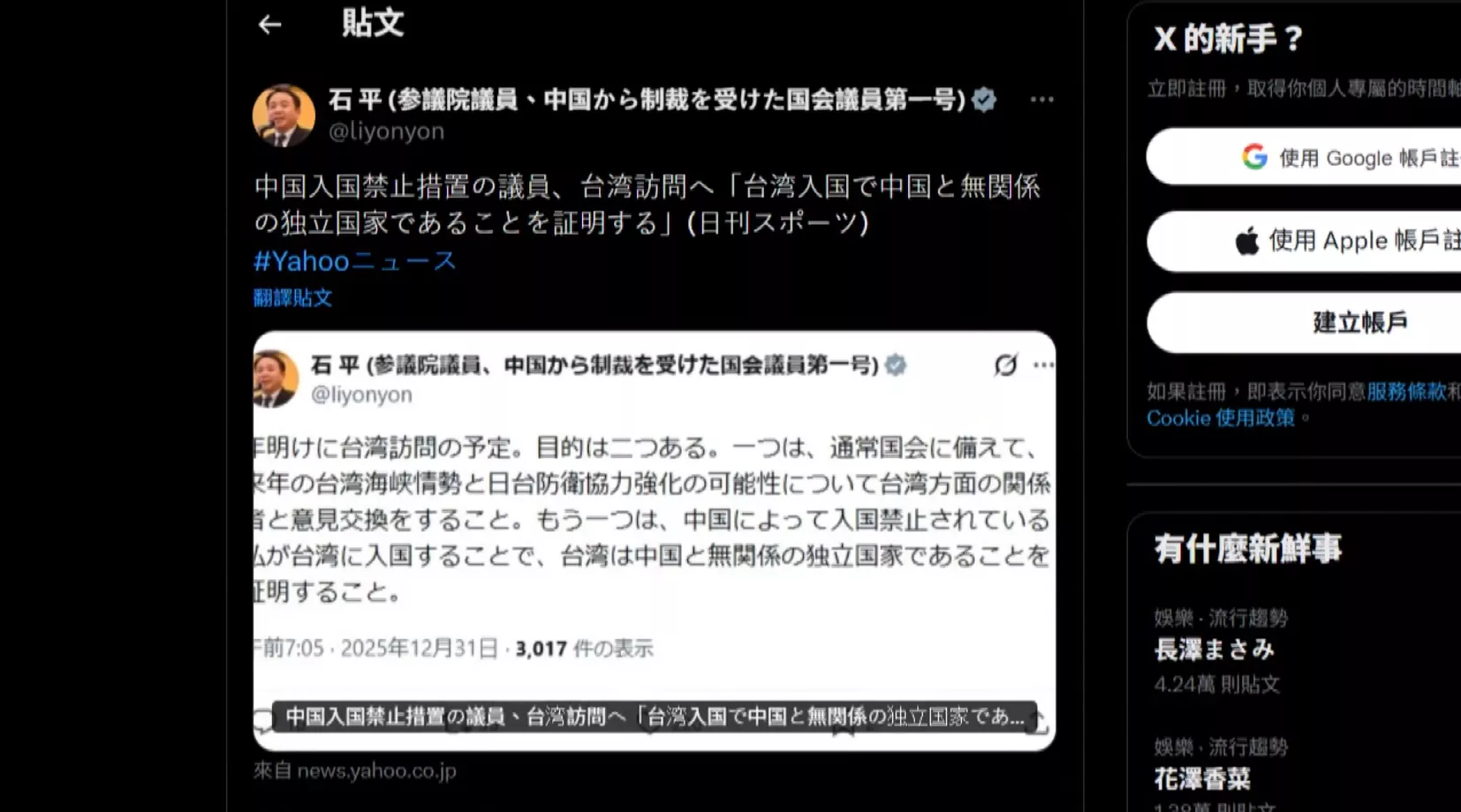 日本參議員石平予中國禁入境 宣佈訪問臺灣