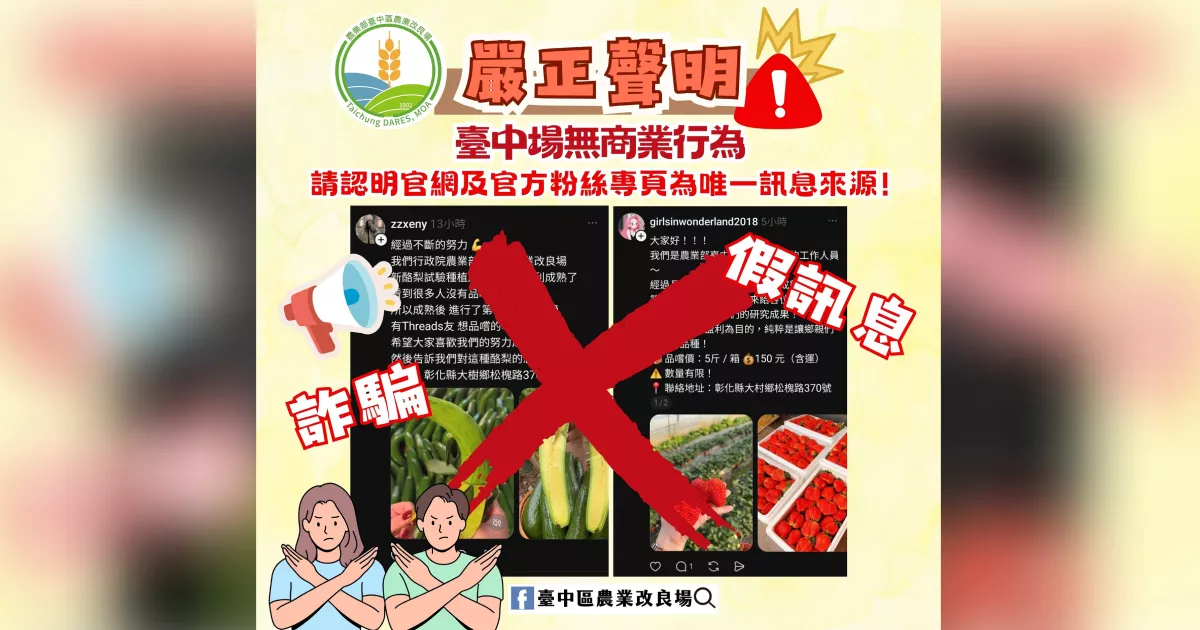 農業部多區農改場都在官網發出聲明,呼籲留意冒名販售水果的社群詐騙。(圖/農業部台中區農業改良場) -