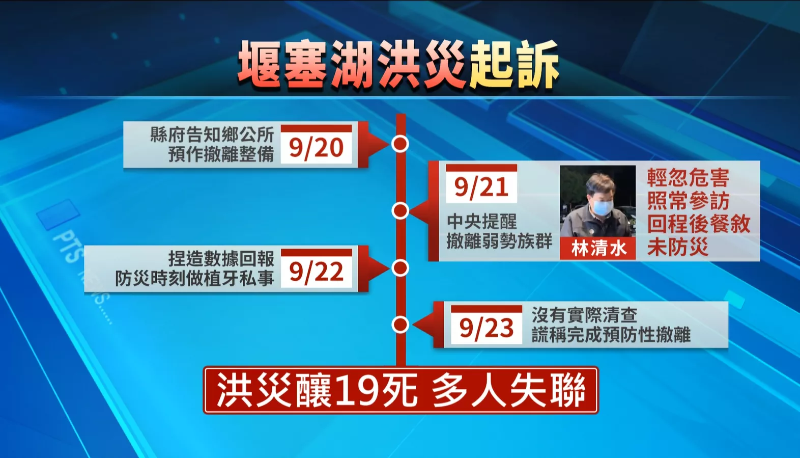 |地方去(2025)年的馬太鞍溪堰塞湖洪災,造成19人死亡、多人失聯,光復鄉長林清水等人被指控撤離不力,檢方認定,林清水罔顧權責機關一再指示,未落實執行強制撤離,還在應全力防災之際處理私事,跑去鳳林鎮植牙,甚至沒有實際清查,憑空捏造數據、粉飾太平,謊稱完成「預防性撤離」,依涉犯過失致死等罪嫌起訴,更具體求刑10年。