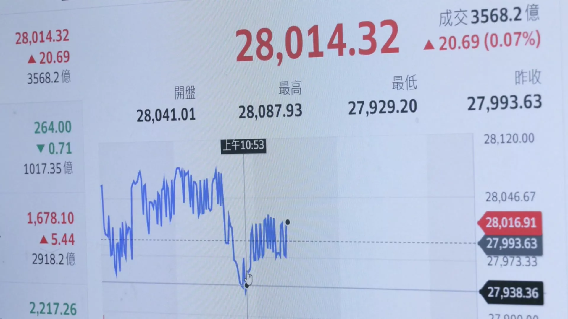 |產經美中新一輪貿易協議露曙光,美股4大指數收紅,台股今日早盤一度衝上2萬8000點後翻黑,台積電力守平盤,記憶體族群持續點火,加權指數接近午盤來到2萬7970點震盪,預估成交量約6800億元
