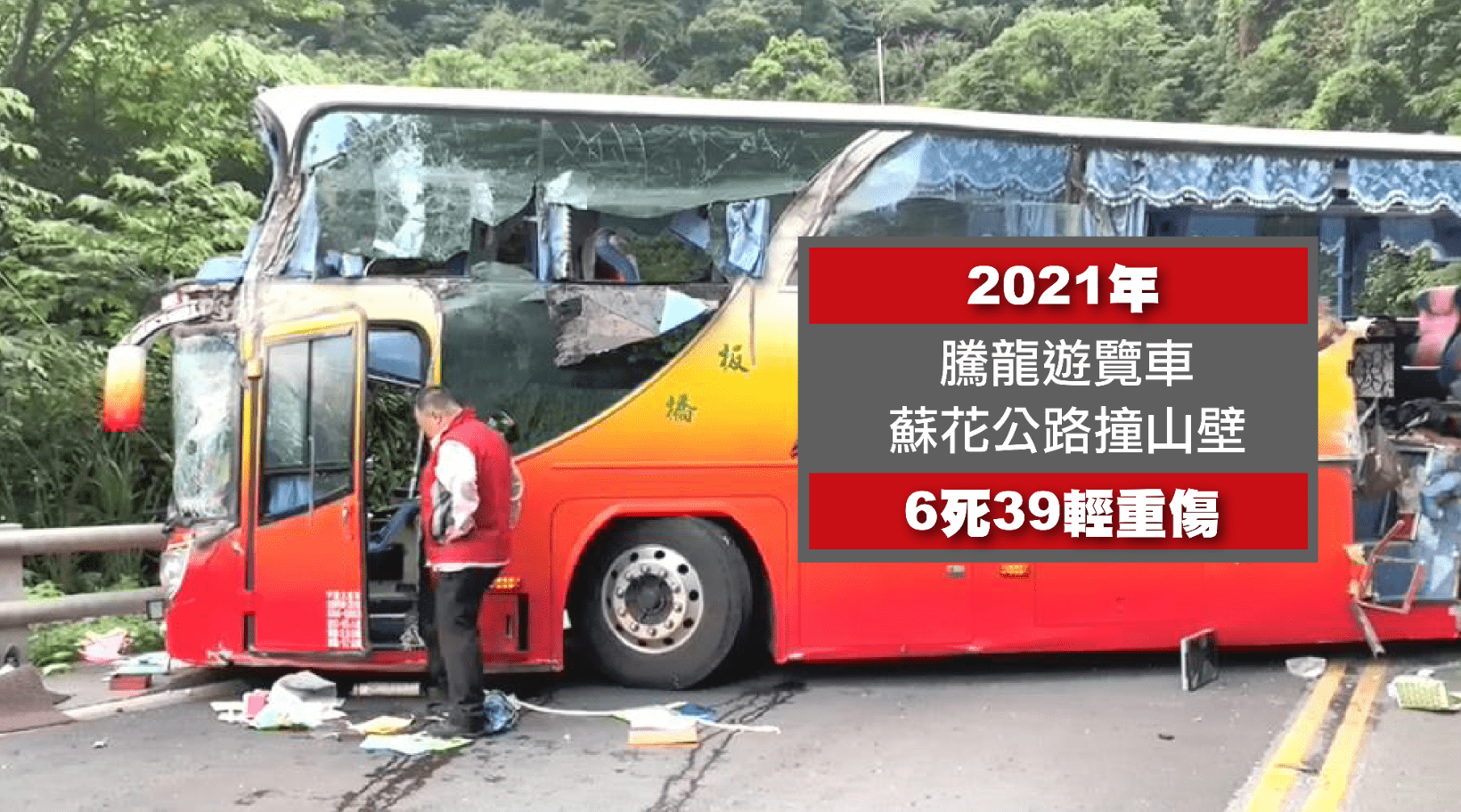 - 宜蘭縣──蘇花公路台9線》遊覽車下坡加速撞山壁 釀6死39輕重傷