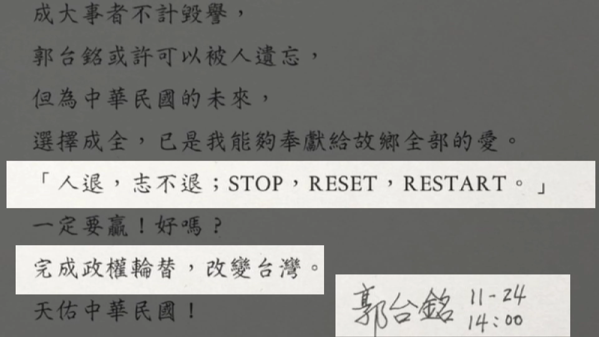 首頁 熱門議題 2024台灣大選 2024台灣大選 2024大選 總統參選人 侯友宜 國民黨 賴清德 柯文哲 2024年1月13日將舉行中華民國第16任正副總統選舉與第11屆立法委員選舉,目前民進黨提名現任副總統賴清德,國民黨提名新北市長侯友宜,民眾黨提名前台北市長柯文哲三方競逐。 讚 加入公視會員,按讚收藏你關注的報導 登入會員 下次再說 2023/11/27 07:31 2024大選/侯趙直搗賴本命區台南造勢 趙少康:藍白在立院仍可合作 2024大選 國民黨不分區立委 總統參選人 趙少康 ... 侯康配 以巴戰爭 侯友宜 俄烏戰爭 台南 合作 國民黨 立法委員 賴清德 造勢 韓國瑜 2023/11/26 18:39 2024大選/稱看好度在野最高 柯文哲:越被藍綠圍攻反彈越強 2024大選 不分區立委 台灣民眾黨 柯文哲 ... 民眾黨不分區 不分區名單 參選總統 反彈 在野 民眾黨 登記參選 總統參選人 藍白合 藍白合破局 黃國昌 黃珊珊 2023/11/26 12:31 2024大選/賴蕭輔選首合體 蕭美琴返花蓮拚翻轉 2024大選 國家 總統參選人 花蓮 ... 蕭美琴 台海和平 台灣 合體 民進黨 立委補選 競選總部 賴清德 賴蕭配 輔選 2023/11/26 12:31 2024大選/總統參選人確定三腳督 趙少康籲棄柯實現政黨輪替 2024總統選舉 三腳督 政黨輪替 柯文哲 ... 總統參選人 趙少康 2024大選 侯友宜 副總統 國民黨 國民黨主席 朱立倫 立委參選人 總統馬英九 藍白 賴清德 2023/11/25 19:31 2024大選/藍營迅速劃清界線 柯低調不談相關議題 2024大選 柯文哲 民眾黨 站台 ... 總統候選人 總統參選人 侯友宜 國民黨 國民黨主席 朱立倫 民進黨 登記參選 立委參選人 總統蔡英文 藍營 藍白合破局 行政院長 議題 賴清德 2023/11/25 12:31 2024大選/朱嚴禁黨員邀柯站台 侯友宜:無模糊空間 2024大選 國民黨 登記參選 立委參選人 ... 站台 總統參選人 侯友宜 副手 國民黨主席 朱立倫 柯文哲 核一 民眾黨 民進黨 空間 藍營 賴清德 2023/11/24 19:31 2024大選/郭台銘宣布退選 呼籲「完成政黨輪替」 2024大選 創辦人 參選總統 政黨輪替 ... 郭台銘 中華民國 副手人選 呼籲 柯文哲 獨立參選 總統參選人 賴佩霞 退選 2023/11/24 12:31 2024大選/蕭美琴喊國會過半 民進黨立院黨團熱情迎接 2024大選 國會過半 民進黨 總統參選人 ... 蕭美琴 許立明 不分區立委 副總統 台北大學 台灣 民進黨團 秘書長 立委參選人 賴清德 金融博覽會 金融科技 靖娟基金會 2023/11/24 12:31 2024大選/柯文哲登記參選 副手新光千金吳欣盈 2024大選 吳欣盈 柯文哲 登記參選 ... 總統參選人 柯文哲副手 Yahoo 中華民國 保險公司 副手人選 千金 台灣 新光人壽 柯文哲訪美 歐洲議會 民眾黨 民進黨 立法委員 總統大選 總經理 美台國防工業會議 賴佩霞 郭台銘 郭台銘副手 2023/11/24 12:31 2024大選/趙少康任侯友宜副手 象徵本土藍結合戰鬥藍 2024大選 侯友宜 國民黨主席 戰鬥藍 ... 總統參選人 趙少康 中國國民黨 中間選民 副手 北北基宜 台北市長選戰 國民黨 本土 朱立倫 環保署長 總統大選 藍營 選戰 政治金童 2023/11/24 11:36 2024大選/柯文哲攜手吳欣盈登記參選 稱藍白合仍未破局 不分區立委 吳欣盈 新光人壽 柯文哲 ... 民眾黨 登記參選 碩士學位 2022年 2024大選 世界經濟論壇 中選會 保險公司 台灣 國會助理 宣誓就職 德明財經科技大學 新光醫院 歐洲議會 民眾黨不分區 破局 立委 總統候選人 總統選舉 英國保守黨 蔡壁如 藍白合 行政院長 2023/11/24 07:31 2024大選/柯稱今日登記參選 國民黨11時開中常會 2024大選 中常會 國民黨 登記參選 ... 總統參選人 副手人選 侯友宜 政黨輪替 柯文哲 民眾黨 民進黨 獨立參選 總統大選 賴清德 2023/11/24 07:31 2024大選/大選登記倒數 藍白整合會談仍未達共識 侯友宜 朱立倫 結局 總統參選人 ... 藍白 郭台銘 2024大選 公開 共識 台灣 國民黨主席 在野整合 感恩節 政黨協商 整合 會談 柯文哲 民調 發言 簡訊 總統馬英九 馬英九 黃士修 2023/11/23 19:31 2024大選/藍白合三方會談變5人 最後一哩路暫時談不攏 侯友宜 公開 君悅飯店 柯文哲 ... 簡訊 總統參選人 郭台銘 協商 台灣 同意 國民黨 國民黨主席 在野整合 政黨協商 政黨輪替 朱立倫 總統大選 董事長 藍白合 馬英九 馬英九總統 2023/11/23 18:29 2024大選/在野5人整合無共識 柯文哲24日將攜副手登記 2024大選 侯友宜 整合 柯文哲 ... 總統候選人 總統參選人 郭台銘 公開 君悅飯店 國民黨 國民黨主席 在野 政黨協商 政黨輪替 會談 朱立倫 簡訊 總統馬英九 退選 馬英九 11 11