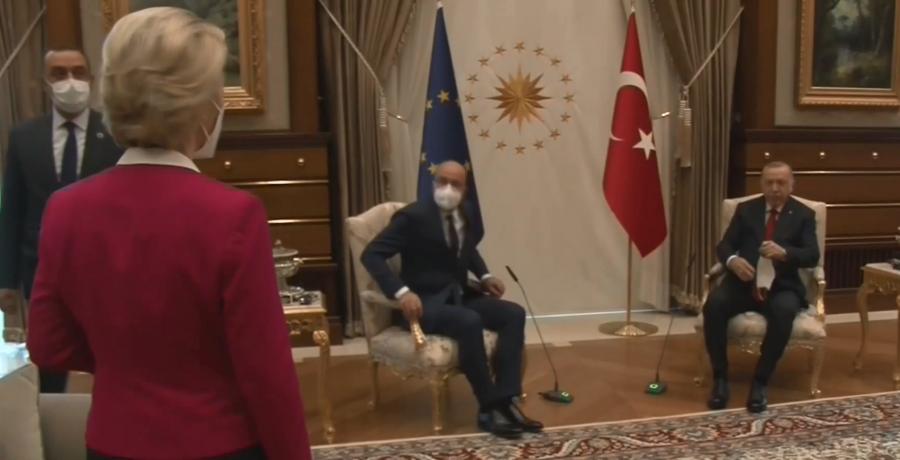 | 地方歐盟執委會主席馮德萊恩,和歐洲理事會主席米歇爾,在日前拜訪土耳其總統艾爾多安,結果卻發現現場只有準備兩張椅子,讓馮德萊恩沒有座位,一度尷尬站在旁邊,這也讓歐盟執委會不滿,外界也質疑有歧視女性嫌疑。 穿著紅色的西裝外套,歐盟執委會主席馮德萊恩,跟歐洲理事會主席米歇爾,在土耳其當地6日,一起到土耳其首都安卡拉拜訪土耳其總統艾爾多安時,卻發現3個人的會議只準備2張椅子,兩位男士直接走向會議室正中央的座位