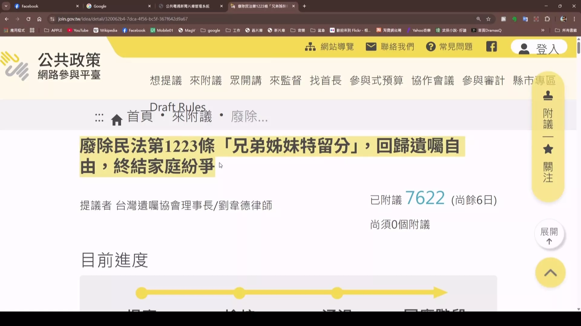 | 生活台灣遺囑協會近期於公共政策網路參與平台提案,主張廢除《民法》中,遺產之「兄弟姊妹特留分」規定,回歸遺囑自由,獲近7000人附議。法務部回應,已就此議題委託研究並廣納意見,預計今(2025)年底會提出成果報告,並於2026年初啟動修法。