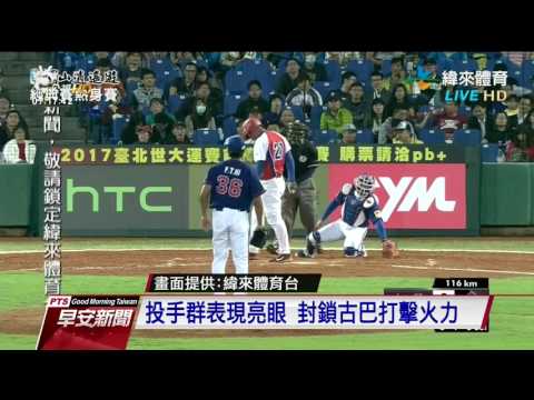 |世界棒球經典賽3月6號即將在南韓登場,中華隊前天和強敵古巴隊的第一場熱身賽以2:6落敗,昨晚兩隊在台中洲際球場原地再戰,台灣投手群表現相當亮眼,終場以4比2擊敗古巴隊。目前中華隊在熱身賽取得5勝1敗的佳績,明天23號,全隊將飛往日本移地訓練。 2017年世界棒球經典賽,昨天晚間中華隊在台中洲際球場與古巴進行第二場交流賽,先發投手潘威倫首局失兩分、第二局回穩沒失分,中華隊在3局下由陳鏞基敲出