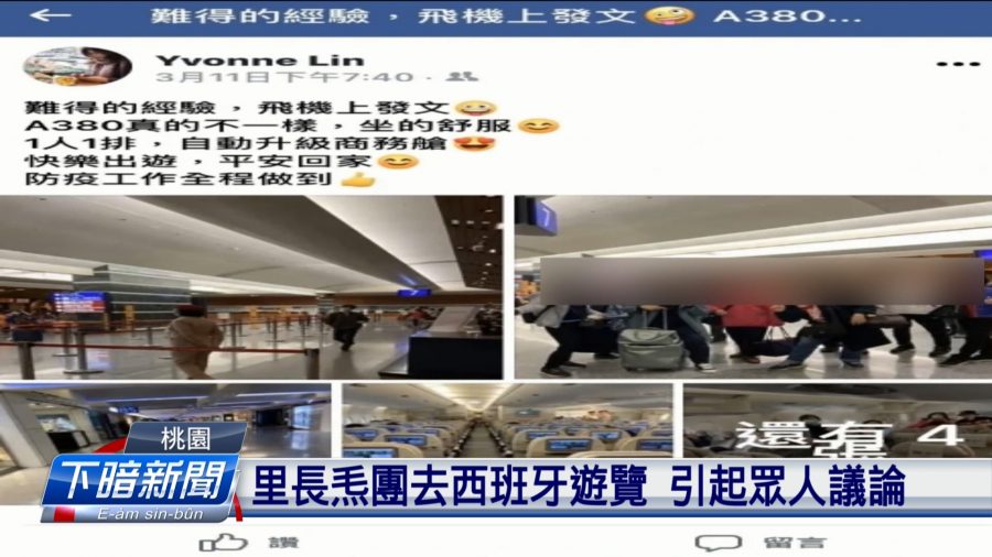 |新北市中和區有一个里長相招去西班牙遊覽,受著民眾大大的議論,致使遮的人提早佇今仔下晡轉來台灣。這个里長表示佇這個時間點出國,確實是欠思量,伊強調袂去領一萬四千箍在家檢疫的補助。新北市政府也講,會嚴格執行這陣人在家檢疫的工課。 新北市中和區瓦磘里里長林綺芳一下飛機,就受到媒體關注,因為她上週在臉書PO出3月10號,帶著15人出團、準備飛往西班牙旅遊的照片,遭網友怒轟不顧疫情,硬要出國。不過該團提前