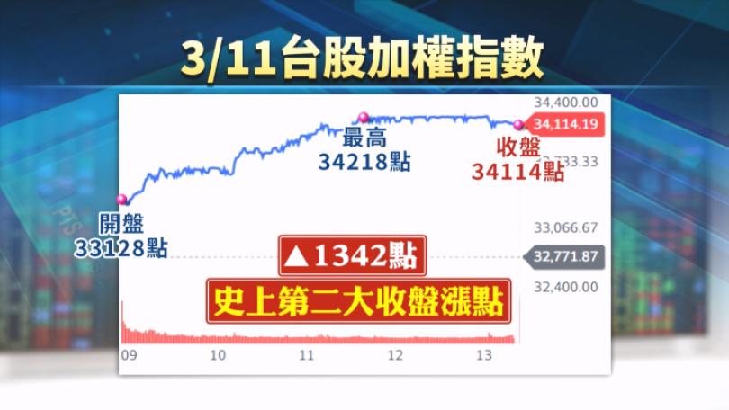 美股收紅激勵 台股一度漲1491點重返3萬4