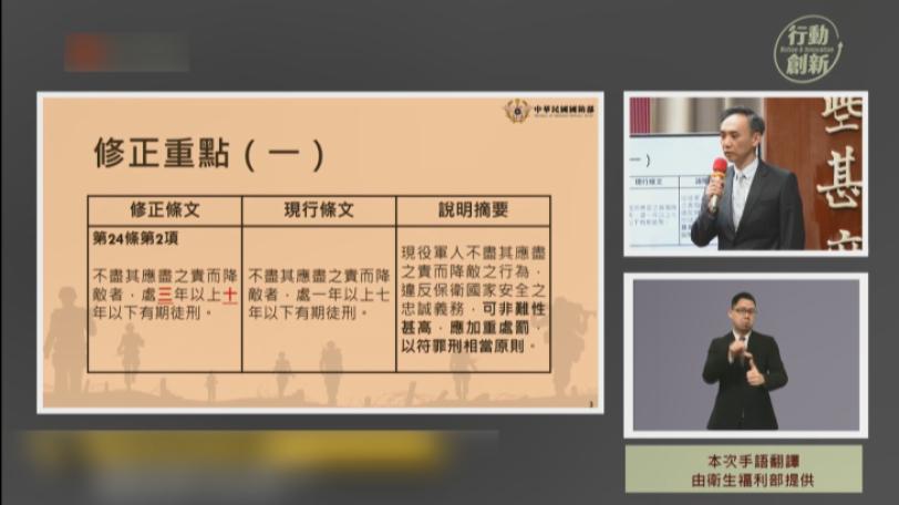 |針對中共加大滲透國軍的力頭,這幾年有誠濟官兵講欲效忠中共,也出現真濟間諜,嚴重影響國安,為著防止這款問題,國防部推動陸海空軍刑法修法,今仔日(12/18)佇行政院會通過修正草案,弱勢現役軍人無盡責來投降,上重判10年。(新聞標題、導言為台語文)