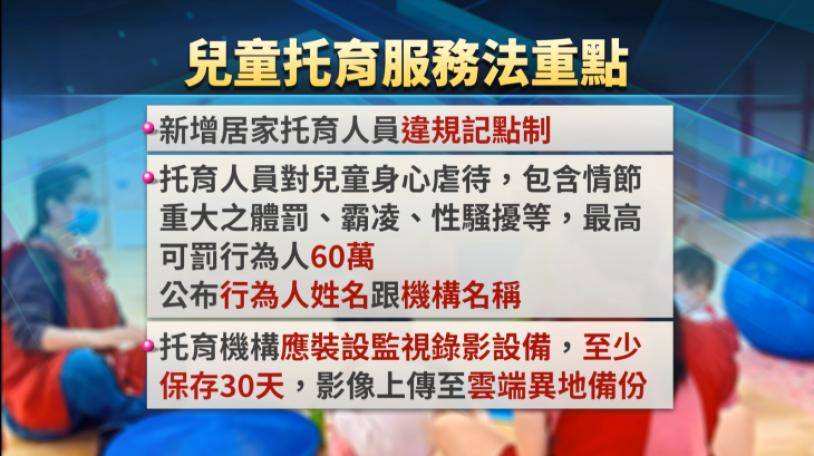 |社福人權剴剴案受到高度關注,也讓兒虐跟幼兒托育再成焦點,立法院會今(14)日三讀通過《兒童托育服務法》,法案新增居家托育人員違規記點制;規定托育機構應裝設監視錄影設備,至少保存30天並上傳到雲端備份;托育相關人員如果對兒童有身心虐待或情節重大的性騷擾等,最高可罰60萬元,並且公布行為人姓名跟機構名稱。