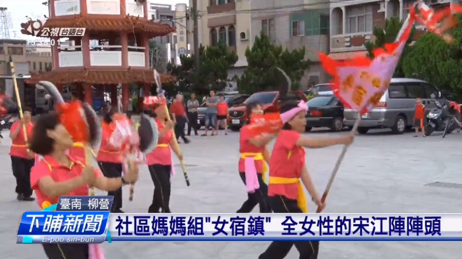 |在臺南柳營有一群社區媽媽,組成全女性的宋江陣,走陣型、弄刀銃是考袂倒,ﰀ也創造家己的風格,用女性的力量,予藝陣繼續傳承落去 跑陣型、舞刀弄槍,都難不倒這一群身穿粉紅上衣的全女性「宋江陣」。這個特殊的陣頭,是由台南柳營、士林社區的媽媽教室組成的。以前社區有過宋江陣,後來斷掉,三年前這群媽媽再度為社區組這團「女宿鎮」。 ==女宿鎮隊長 陳曜雲== 想說以前說我們在士林社區 士林里有一個宋江陣 所以我