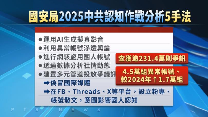 |兩岸國安局今(11)日發布「2025中共認知作戰分析報告」,指出中共整合黨政軍及民間企業的資源與技術,鎖定「疑美論」、「疑軍論」等敘事炒作,運用5大手法對台傳散爭議訊息,去(2025)年一整年,國安團隊就查獲超過231萬則爭議訊息,以及4.5萬組異常帳號。
