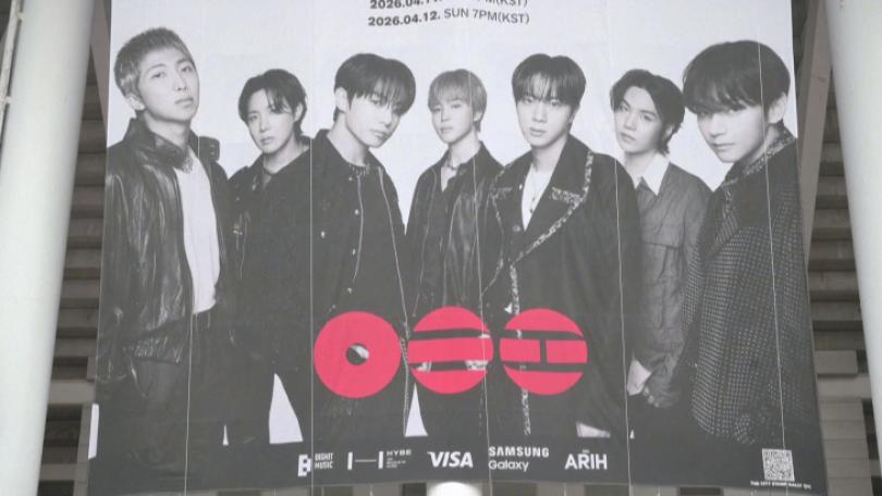 |全球人氣天團BTS在今(2026)年3月復出後,今(10)日展開全球巡演的第一站,在南韓高陽體育館舉行演唱會。雖然當天下著大雨,仍然澆不熄粉絲的熱情。還有人即使沒有買到門票,仍然在會場外跟著音樂一起大聲合唱。