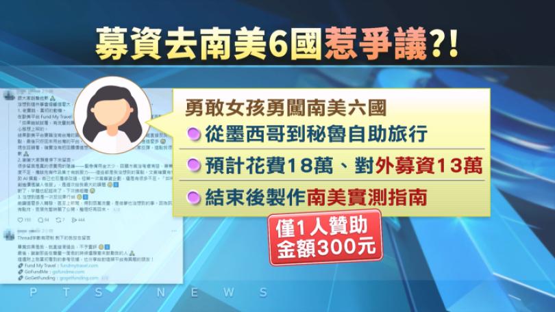 |生活日前在募資平台出現了一名台灣女孩,表示自己要自助旅行,闖蕩南美6國,發起募資13萬元旅費計畫引發爭議,網友質疑旅費應該自己賺,目前這項計畫已經下架,當事人也發文道歉,坦言沒有把回饋價值想清楚。目前數位部正在訂定草案,規範集資平台定型化契約,關於集資平台爭議,未來將會更加明確並有所依循。