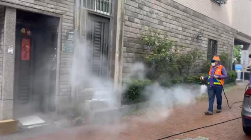 |環保人員到高鐵高雄站周邊人行道,進行大消毒,因為有確診者足跡!國內新冠本土疫情,29號週一新增33例本土病例,其中基隆警員小吃店群聚、新增9例;台東卑南家庭群聚、新增3例;新北中和某社區群聚、新增7例;三重業務員群聚、新增1例;大潭電廠群聚、新增3例;高雄化工廠群聚、新增2例;另外還新增4縣市、共6起感染源待釐清案件,其中台北有3例,包括一名孕婦、松山區的看護和雇主;新北有2例;基隆有1例;彰化夫