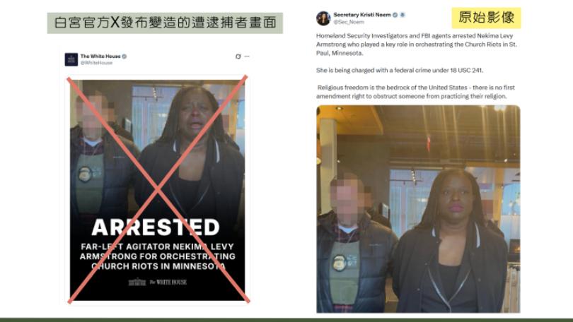 |全球美國明尼蘇達州近期因移民暨海關執法局(ICE)掃蕩移民引發抗爭,白宮官方X帳號22日發布一張該州人權律師遭逮捕照片,卻被發現疑似經過變造,將其原本平靜神情修改為淚流滿面。自川普第二任期以來,白宮已被發現超過10次使用經過AI修改的影像。
