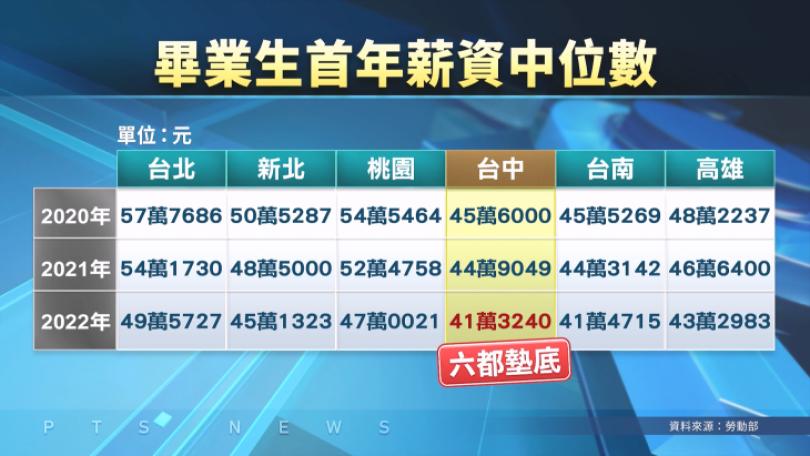|地方勞動部最新統計,台中市大專院校畢業生第一年的薪資中位數是41萬3240元,在六都中最低。有民眾覺得並不意外,甚至坦言許多人都是去北部發展另尋出路。台中市府認為,與產業結構有關,已經積極輔導開發高薪職缺、舉辦徵才活動。