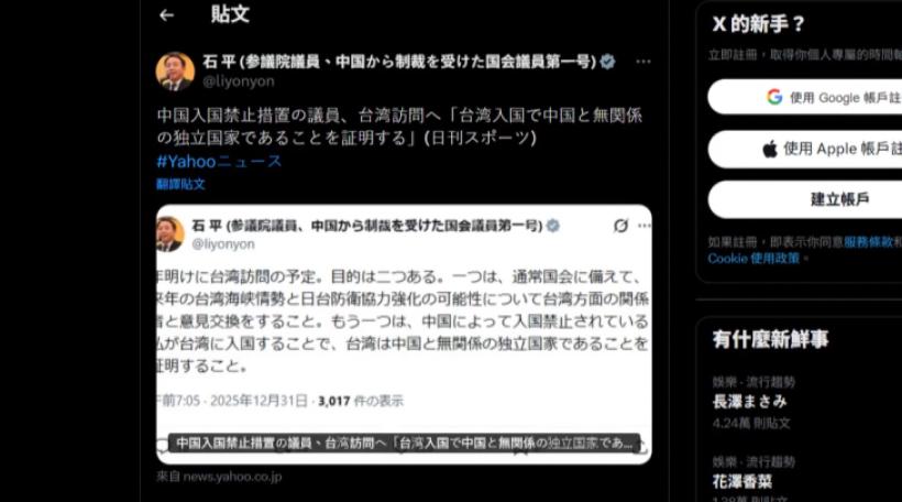 |兩岸共軍軍演結束後,中國國家主席習近平接著就在新年談話再提統一,引起關注。面對共軍軍演,陸委會強勢反擊,不論中共說什麼、做什麼,都不能改變中華民國存在115年的事實。此外,近期多位日本議員訪台,首位遭中國制裁的日本維新會中國裔參議員石平也發文有意訪台。他表示被中國禁止入境,但卻能到台灣,證明台灣是與中國無關的獨立國家。