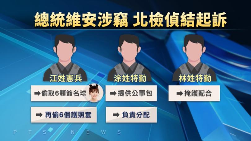 總統賴清德今(2026)年2月到台北大巨蛋觀看棒球,結果有3名隨扈竟然在場勘時,涉嫌順手牽羊,偷走簽名棒球及護照套,北檢今(30)日偵結,將3人提起公訴;國安局表示,對涉案3人已經在第一時間各記兩大過,也列入優先汰除名單。