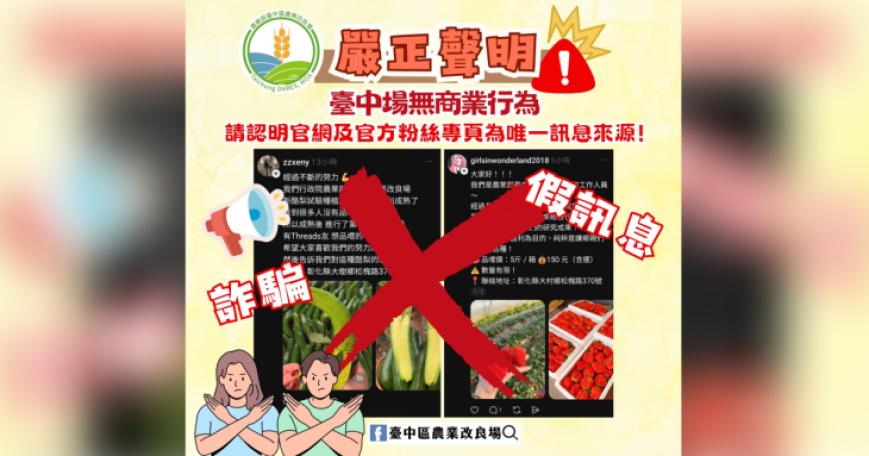|生活近來網路社群出現眾多假冒農改場名義、販賣改良試種蔬果的詐騙貼文,多區農改場對此陸續發文澄清,除強調未曾參與任何商業行為外,也呼籲民眾慎防冒名詐騙,並應認明以官網或官方粉絲頁為唯一訊息來源。