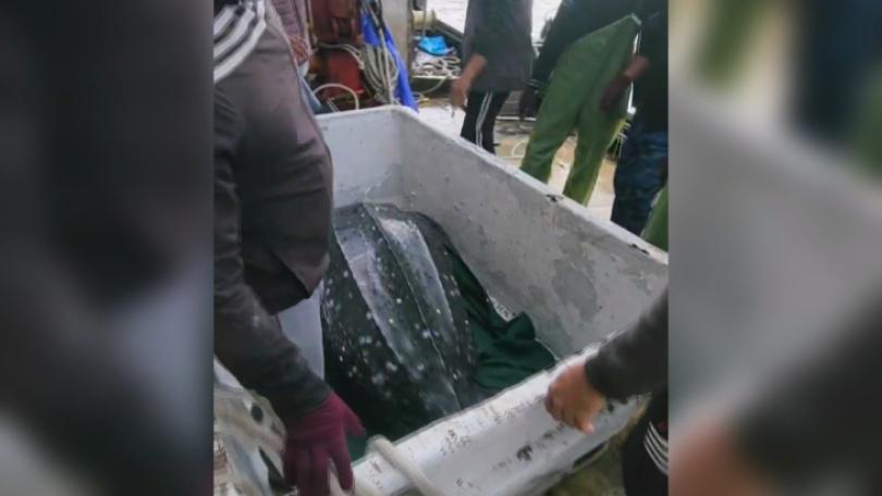 |環境宜蘭的一處定置漁場14日上午發現一隻受困海龜,經確認是海龜中體型最大的革龜,背甲長148公分、體重280公斤相當巨大,漁民趕緊通報相關展開救援,但這隻革龜口中遭漁網纏住,暫時無法完全清除,先送往八斗子救傷站治療,後續再安排野放。
